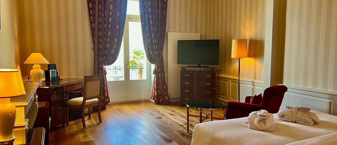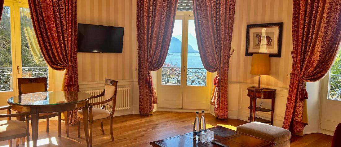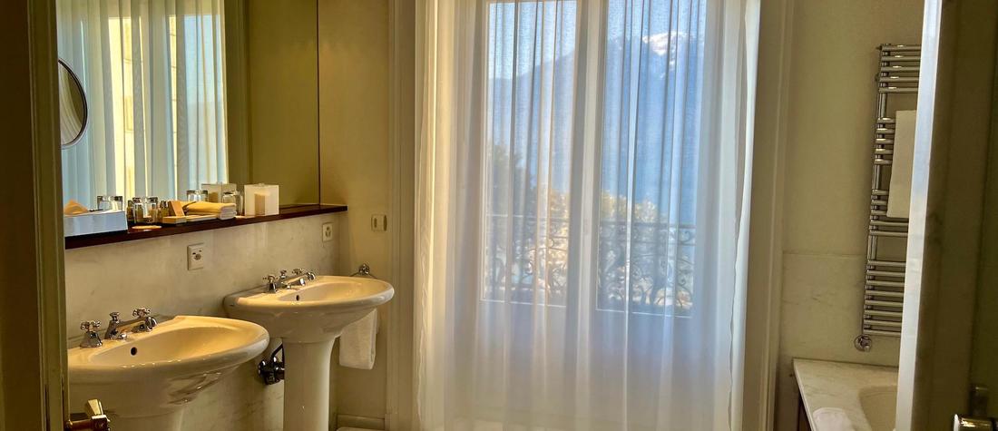 Die Suite Royal Ustinov Lac bietet einen atemberaubenden Blick auf den Genfersee und die Alpen, ist geräumig und außergewöhnlich und verfügt über ein privates Badezimmer mit weißem Marmor, das direkt auf den See blickt.